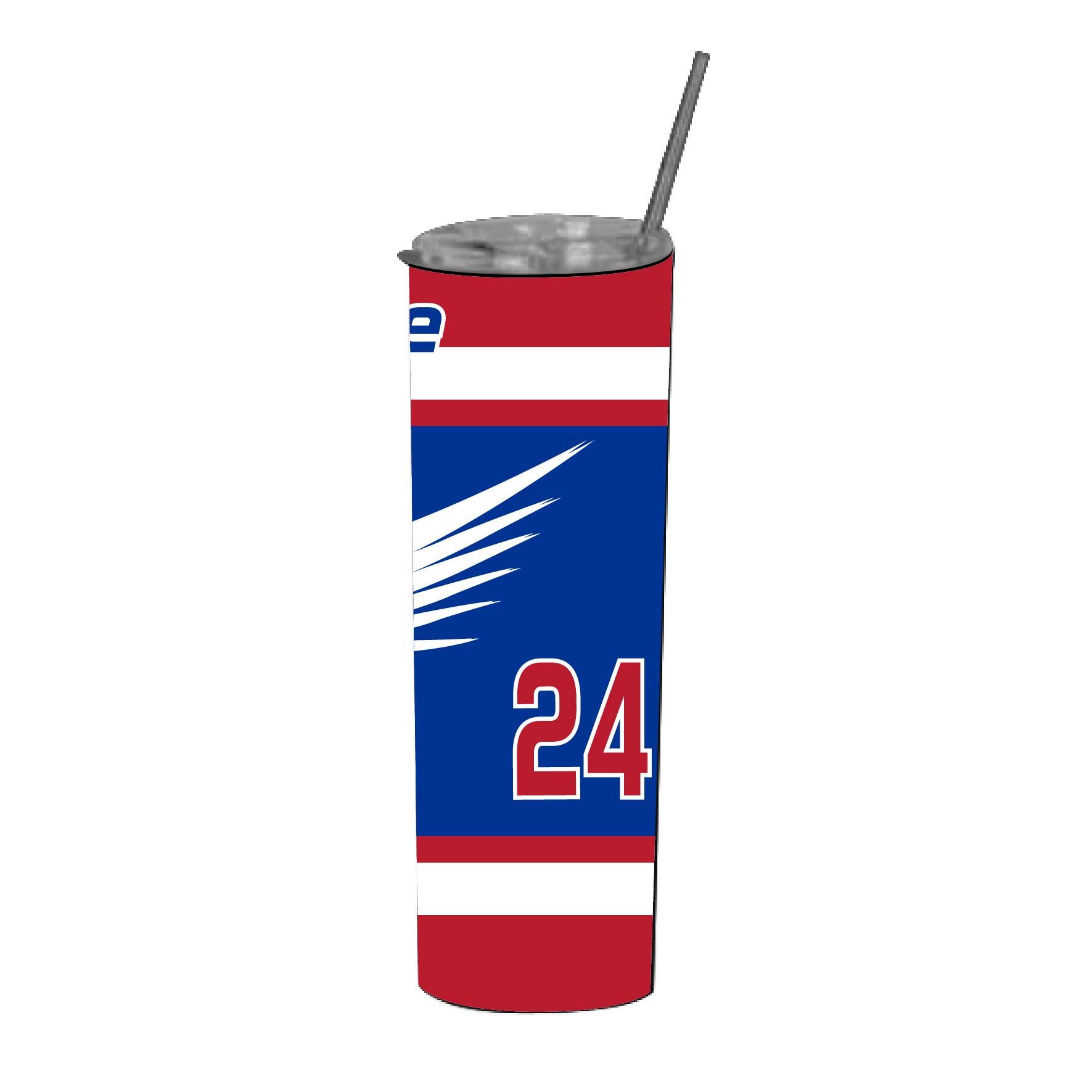 A sublimated Straight 20oz Tumbler with full custom sublimated design specifically for YOUR team with your favorite player name and number! This tumbler includes a metal straw, brush, and lid with opening.